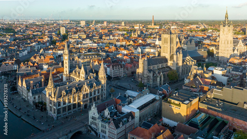 © Oleksandr, Fototapeta premium Ghent Belgium Aerial Flying over downtown area with church cityscape views at sunset time - October 2022