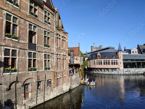 © STUDIO MELANGE, Naklejka premium Ghent, Belgium casual view on the buildings streets and roads with tourists walking around