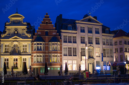 © Jesus Barroso, Naklejka premium Ghent, Belgium; 11/1/2018: Typical colorful belgian houses in a canal of Lys river (Leie) during the night