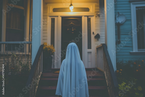 Naklejka premium Ghost standing on house steps at night, ethereal figure in flowing white...