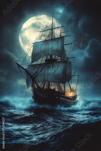 © Creative_Bringer, Fototapeta premium Ghostly pirate ship sailing under a full moon, surrounded by rough, dark ocean waves