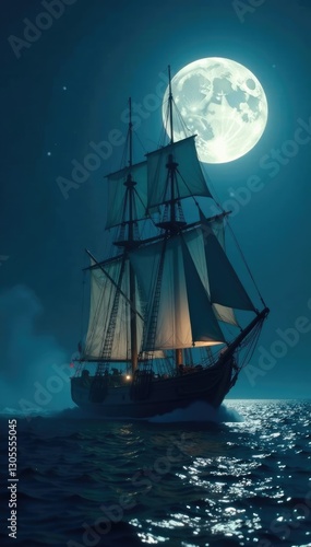 Fototapeta premium Ghostly sails and rigging catch the full moon's light, full moon, illumination