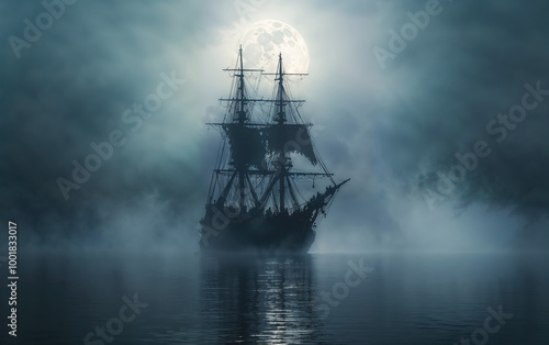 © bluebeat76, Fototapeta premium Ghostly Ship Sailing Under Full Moon in Fog