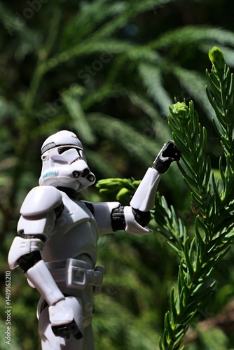 © zayacsk, Naklejka premium GI JOE action figure of Clone trooper examining fresh spring branch tip of coniferous tree called Japanese Cedar or Japanese Redwood or Sugi, latin name Cryptomeria Japonica.