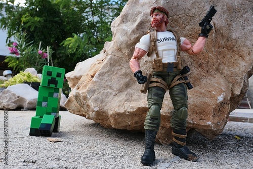 Fototapeta premium GI JOE action figure of survival instructor Outback, verion 2023 Classified edition, armed with pistol, ready to surprise explosive green LEGO Minecraft Creeper, while hidden behind a shoreline rock.