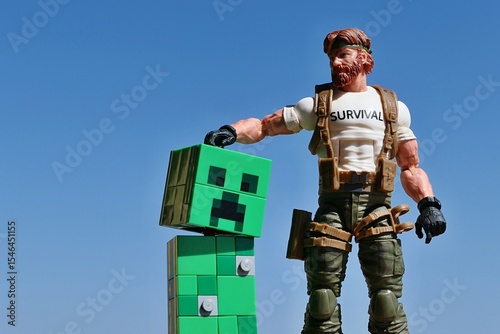 © zayacsk, Obraz premium GI JOE figure of survival instructor Outback, series Classified 2023, stroking head of tamed LEGO Minecraft green explosive mob Creeper on bright daylight sunshine, blue skies in background.