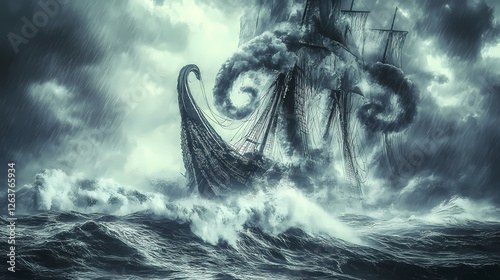 Fototapeta premium Giant apocalyptic sea monster in the middle of a storm at sea. Stormborn...
