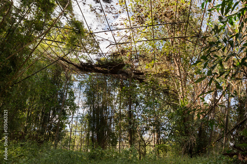© Cyrsiam, Naklejka premium Giant bird aviary abandoned and deserted, overgrown with strange vines and forgotten by man, giant rusty cage overtaken with plants and covered with weeds