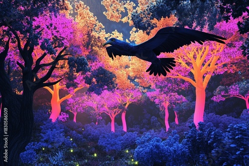Naklejka premium Giant bird soars above vibrant forest filled with colorful trees and magical...