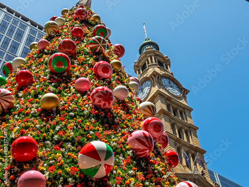 © Juan, Obraz premium Giant Christmas tree decorated with colorful ornaments and flowers standing in Sydney near clock tower