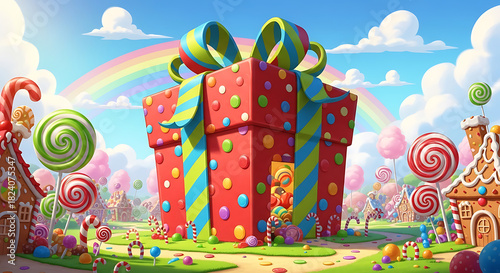 Fototapeta premium Giant colorful gift box with ribbon and candies in a whimsical land.