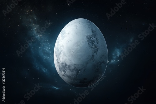 Fototapeta premium Giant egg-shaped planet in space with stars and galaxy in background. Science fiction and cosmic exploration concept