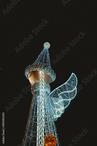 Obraz premium Giant glowing angel figure with wings at night, illuminated by white and blue...