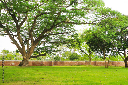 Fototapeta premium Giant green tree green grass in garden and brick wall