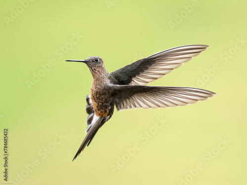 Fototapeta premium Giant Hummingbird in flight on green yellow blur background