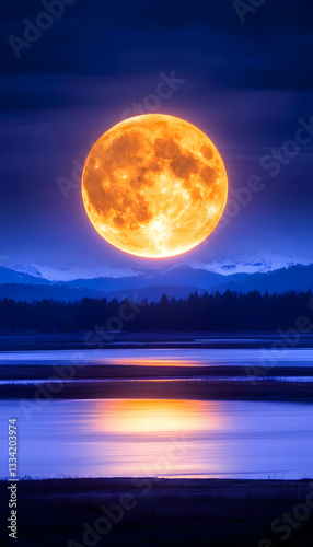 © Lailatul, Fototapeta premium Giant orange moon rising over a calm lake and mountains at night