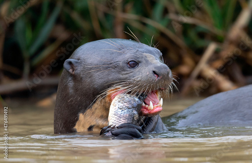 Obraz premium Giant Otter eating fish in the water. Green natural background. Giant River...