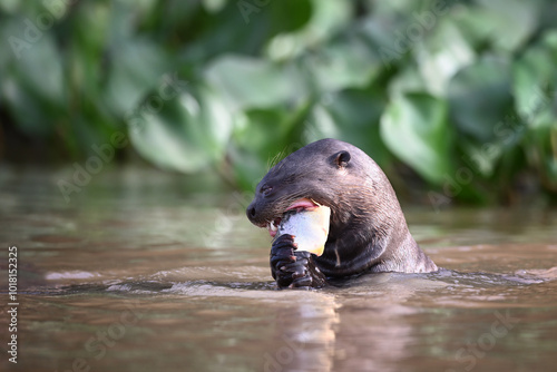 Obraz premium Giant Otter Eating Silver Fish in River with Vegetation in Background