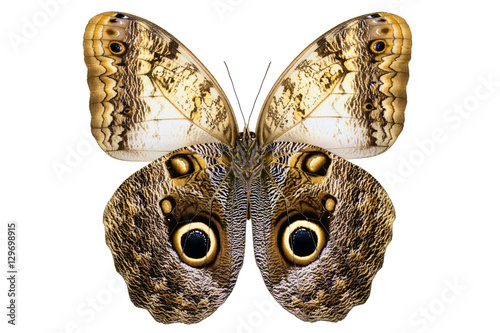 © Roman, Naklejka premium Giant Owl motyl (Caligo memnon, samiec, spód) z lasów deszczowych Amazonii na białym tle