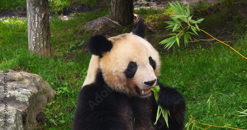 © slowmotiongli, Fototapeta premium Giant Panda, ailuropoda melanoleuca, Adult eating Bamboo Branch