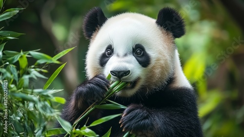 © ThisDesign, Obraz premium Giant panda eating bamboo in a lush green forest generative ai