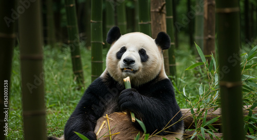 Obraz premium Giant Panda Eating Bamboo in Forest, Close-up Portrait