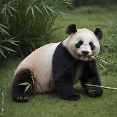 Fototapeta premium Giant Panda Enjoying A Fresh Bamboo Meal Amidst Lush Greenery. Panda Eats