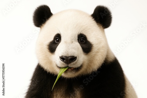 Naklejka premium Giant panda head and shoulders gently chewing a fresh bamboo leaf tip studio wildlife portrait on pure white