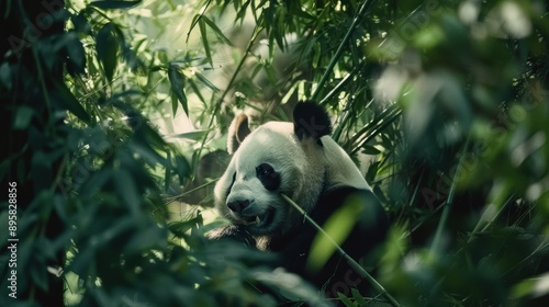 Fototapeta premium Giant panda is chewing bamboo while relaxing in the forest enjoying a sunny day