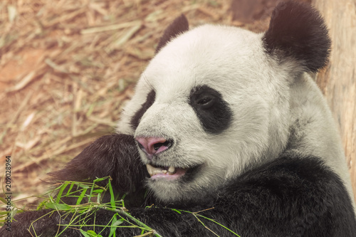 Fototapeta premium giant panda while eating bamboo close up portrait