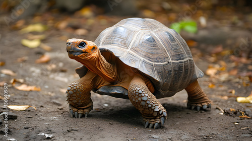 Obraz premium Giant Tortoise's slow Journey: A majestic giant tortoise makes its slow,...