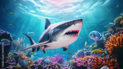 Fototapeta premium Giant tropical shark underwater at bright and colorful coral reef