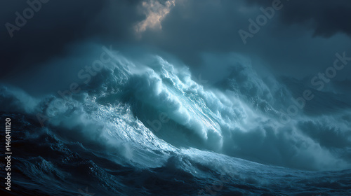 Fototapeta premium Giant tsunami waves, dark stormy sky, perfect storm, huge waves tsunami big waves