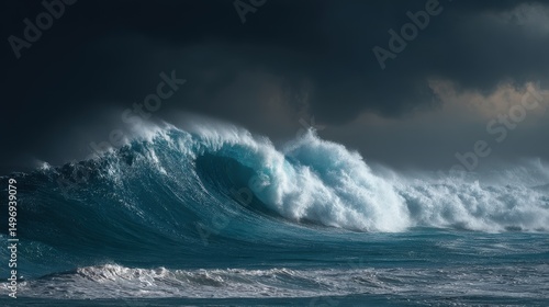 Fototapeta premium giant waves and tsunami hitting under dark stormy sky with perfect storm and...