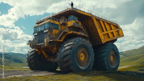 © Biancaart, Obraz premium Giant Yellow Mining Dump Truck in a Mountainous Landscape