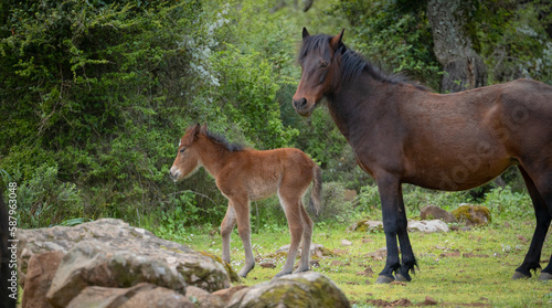 © ivan canavera, Fototapeta premium Giara horses graze in their natural environment, Giara di Gesturi, South Sardinia