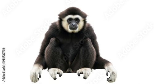 © arif, Obraz premium Gibbon sitting, black fur, white face markings, isolated on white background
