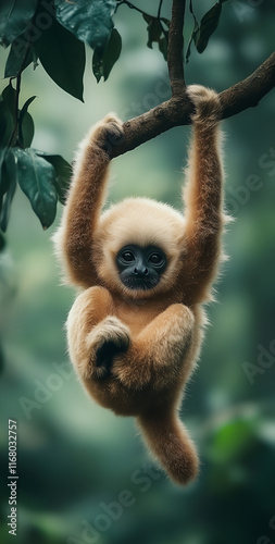 © CHAIYAPHON, Naklejka premium Gibbons hanging upside down from a tree