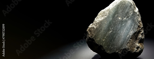 © Serhii, Fototapeta premium Gibbsite is rare precious natural stone on black background. AI generated. Header banner mockup with space.