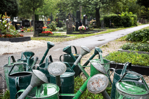 © Gina Sanders, Fototapeta premium Gießkannen auf einem Friedhof