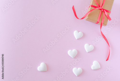 Fototapeta premium Gift box and white heart on a pink background. Valentine's day and romantic concept. Flat lay. Copy space.
