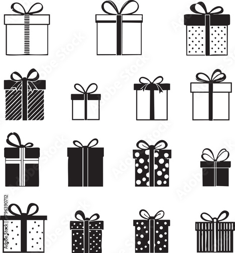 Naklejka premium Gift Box Icon Set Vector – Festive Collection of 15 Decorative Present Designs with Bows, Patterns, and Ribbons for Holiday Graphics, Celebration Cards, and Seasonal Projects