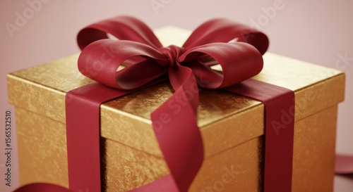 © talkative.studio, Obraz premium Gift box with a red ribbon. A golden gift box adorned with a crimson bow