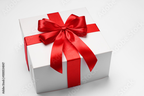 © New Africa, Obraz premium Gift box with red bow on light grey background