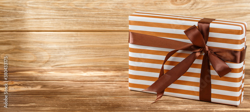 © alexxndr, Obraz premium Gift box with ribbon on wooden background