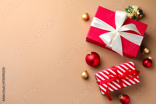 © New Africa, Obraz premium Gift boxes and Christmas decor on beige background, flat lay. Space for text