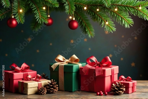© Janmo, Obraz premium Gift boxes and ribbons under a mistletoe hang, pinecones, festive decorations, holly leaves