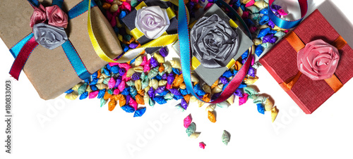 © rudzis, Obraz premium Gift boxes with bows, colored ribbon and multicolored seashells. isolated on white. top view