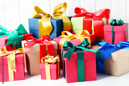 © 5second, Obraz premium Gift boxes with ribbon on white wooden table