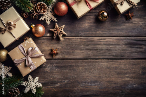 Fototapeta premium Gift boxs on copy space wood background. Christmas theme. Generative ai.